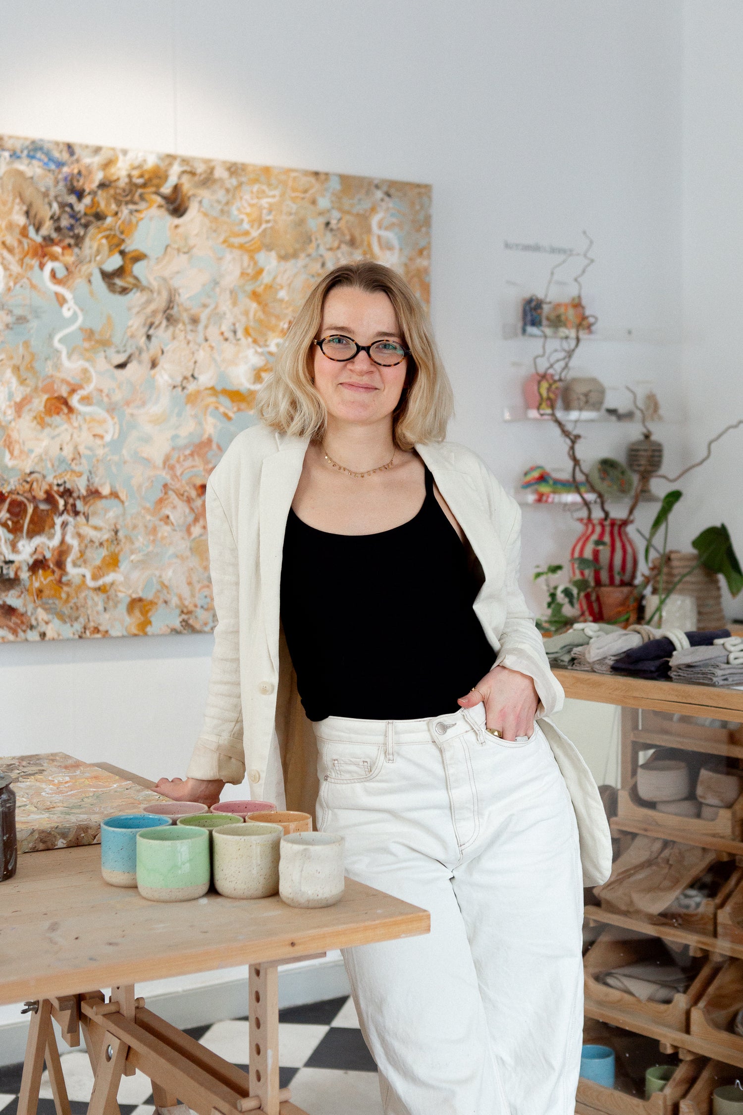Evelina Hedberg is born and raised in Stockholm, Sweden, and discovered her passion for art at a young age. She creates abstract colorful paintings and ceramics.